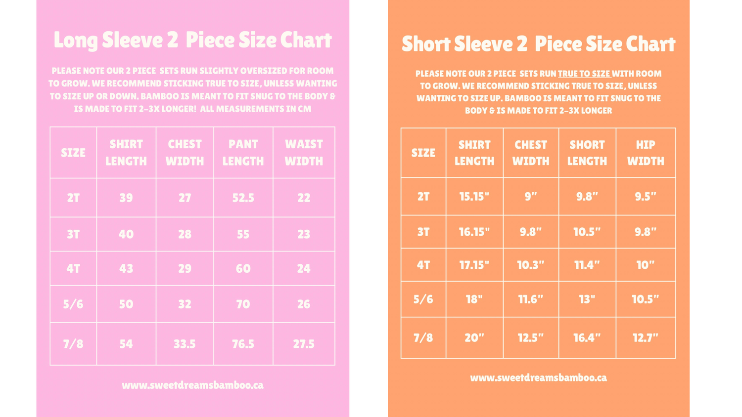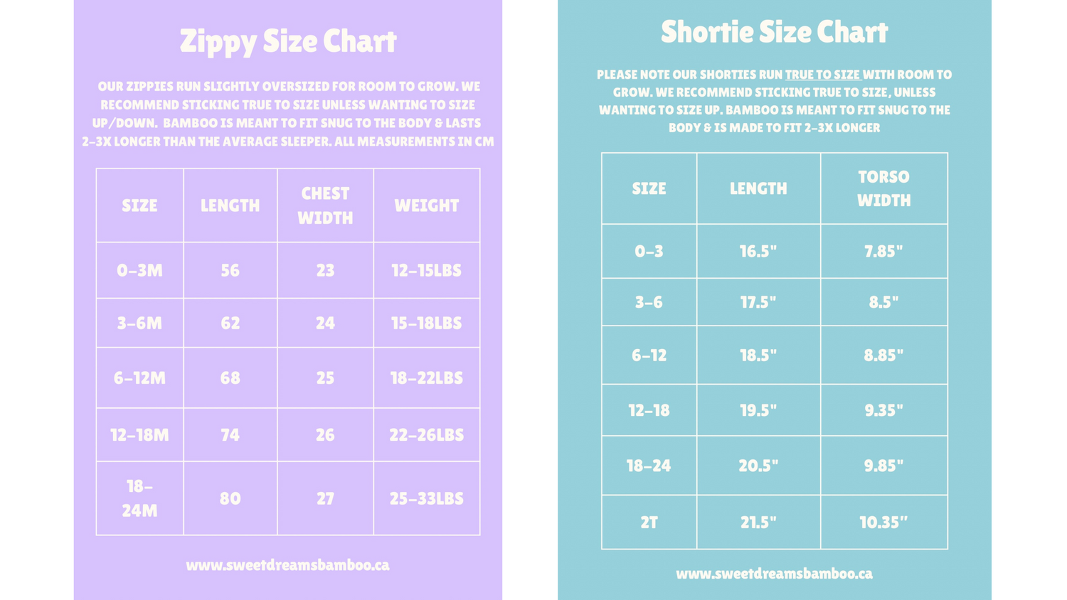 Sweet Dreams Bamboo sizing is below!